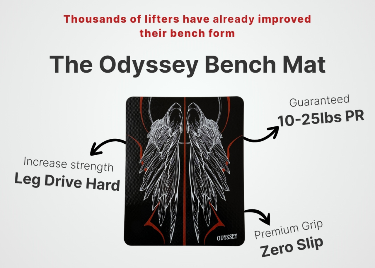The Odyssey Bench Mat delivers premium upper back grip for bench pressing trusted by 700lb+ bench pressers. Join 3500+ lifters who've crushed 225lbs and beyond.