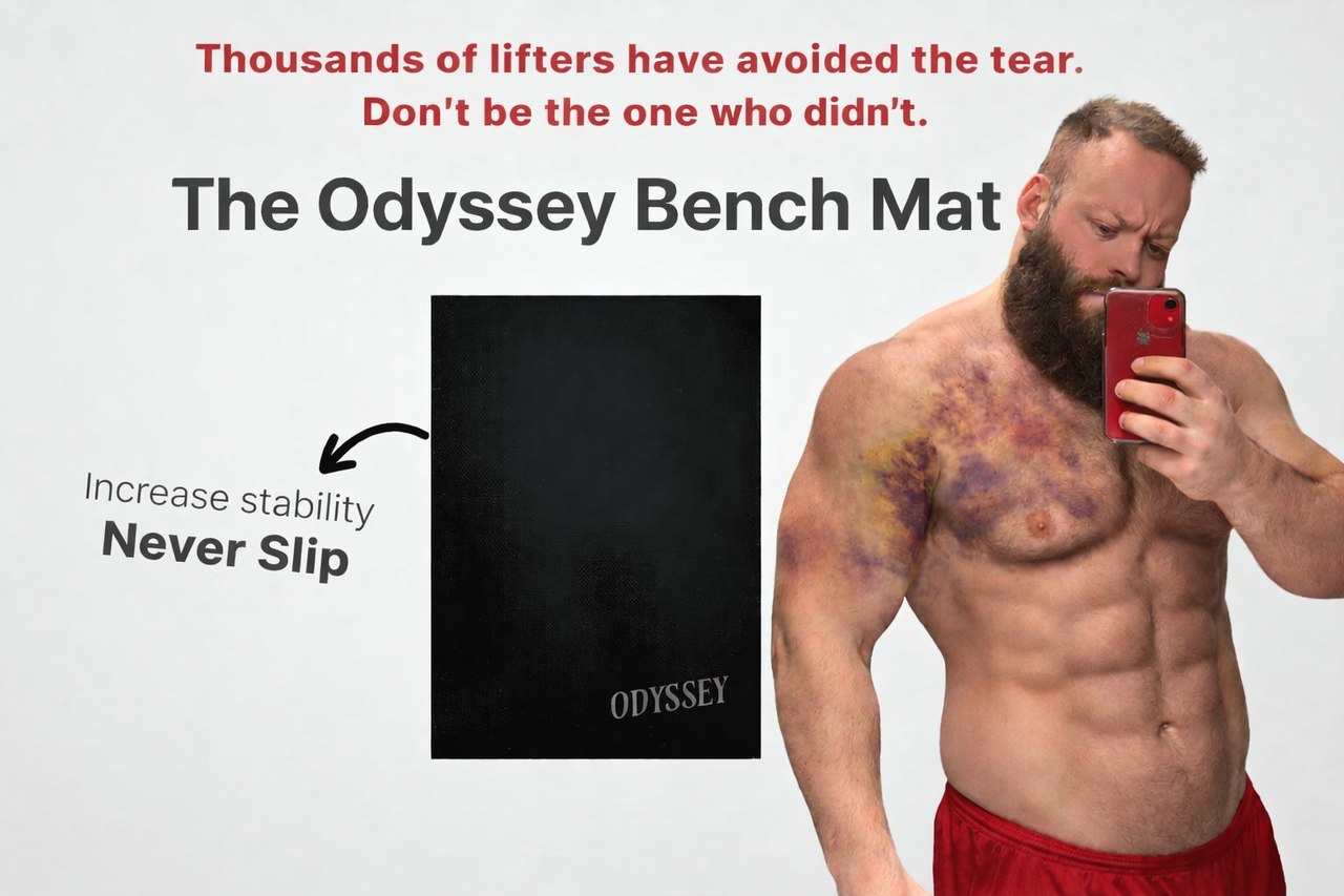 The Odyssey Bench Mat delivers premium upper back grip for bench pressing trusted by 700lb+ bench pressers. Join 3500+ lifters worldwide who've improved there bench setup.